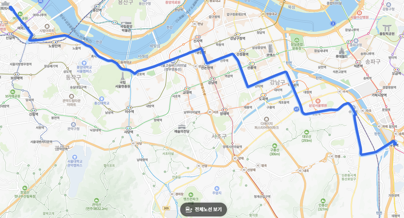대치동 학원가, 고속터미널, 노들섬, 김포국제공항 등 주요 거점을 연결합니다.