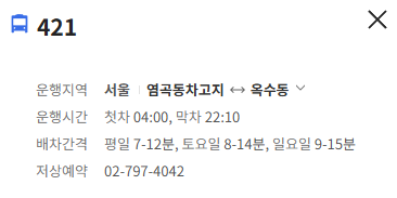 서울 421번 버스 운행노선 염곡동구룡사→구룡사입구→언남고포이성당앞→양재119안전센터앞→양재2동주민센터양재꽃시장→언남고교→말죽거리공원사거리→양재역서초문화예술회관→뱅뱅사거리→래미안아파트파이낸셜뉴스→신분당선강남역→지하철2호선강남역→논현역→신사역→한남대교전망카페→순천향병원입구→한남역용산노인종합복지관→한남동하이페리온→보광동신동아아파트→보광동→한국폴리텍1대학→이태원역보광동입구→이태원역1번출구해밀턴호텔→용산구청이태원시장→녹사평역→전쟁기념관→삼각지역11번출구→숙대입구역→갈월동→서울역9번출구서울스퀘어빌딩앞→남대문시장회현역→명동역4번출구→충무로역한옥마을한국의집→충무로역2번출구→퇴계로5가충무초등학교→퇴계로6가→광희문광희동사거리→충무아트센터스포츠센터중부소방서→신당역4번출구서울중앙시장→왕십리교회→황학교텐즈힐몰→신설동로터리서울풍물시장→신설동역→용두동사거리→제기역약령시장→동대문구청용신동주민센터→마장축산물시장→도선사거리→성동구청→무학여고→응봉동주민센터→응봉동현대아파트→삼성래미안아파트앞→금남시장앞백범학원터→금옥초등학교앞→래미안옥수리버젠옥수중앙교회→옥수파크힐스아파트앞→옥수동회차지