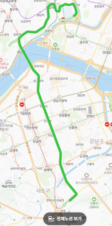 강남과 성동구 직접 연결: 압구정역 이후 동호대교를 이용하여 강남과 성동구(옥수동, 금호동, 금남시장, 응봉동)를 직접 연결해주어 이 구간을 이동하려는 승객들에게 편리합니다. (이 구간은 유사 노선인 463번과 일부 겹치지만, 4211번은 동호대교를 통해 금남시장 방면으로 운행하는 것이 특징입니다.)
