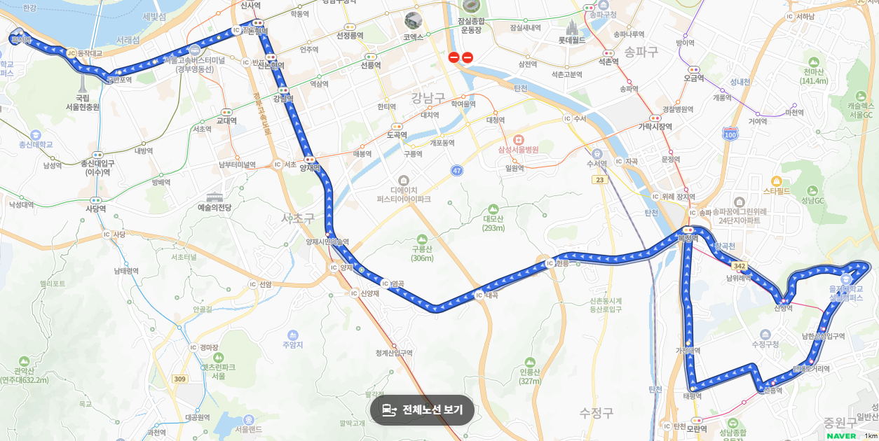 성남의 구시가지(남한산성입구, 단대오거리, 신흥동, 태평동)에서 서울 강남의 핵심지인 양재, 강남, 논현을 지나 고속터미널과 중앙대까지 한 번에 연결합니다. 환승 없이 경기도와 서울의 주요 거점을 이동할 수 있다는 점이 가장 큰 매력입니다.