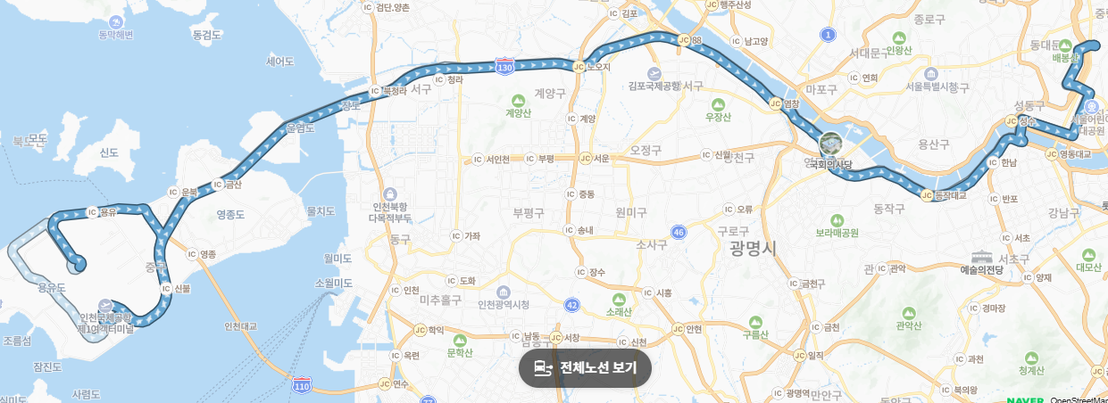 면목동, 장안동, 군자동, 자양동 등 지하철만으로는 공항철도 접근이 다소 번거로운 지역을 촘촘히 연결합니다. 무거운 짐을 들고 여러 번 환승할 필요 없이 집 근처 정류장에서 바로 인천공항 출국장(3층) 앞까지 이동할 수 있다는 점이 최대의 매력입니다.