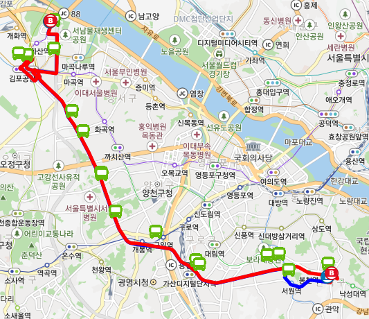 남부순환로: 노선의 대부분을 차지하며, 방화동에서 서울대입구역까지 남부순환로를 따라 운행됩니다.