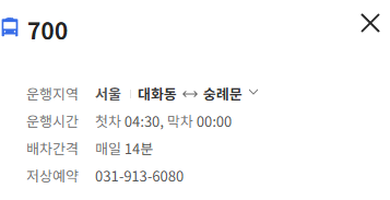서울 700번 버스 운행노선 대화동종점→성저초등학교→장성중학교.대진고등학교→대진고등학교→성저공원.대화동행정복지센터→후곡마을7.8단지→후곡롯데아파트→일산3동행정복지센터→밤가시마을→초가집.저동고교→국립암센터→정발고등학교→마두1동행정복지센터.마두청소년→백석고등학교→백신중학교.이마트→알미공원.일산동구보건소(중)→백석역(중)→백석동.요진와이시티(중)→대곡역(중)→고양경찰서.토당청소년수련관(중)→행신초등학교(중)→행신동(중)→소만마을(중)→서정마을(중)→화도교(중)→화전파출소(중)→덕은초.덕양중학교(중)→덕은동(중)→덕은교.은평차고지앞→수색교→수색역앞→디지털미디어시티역→북가좌동삼거리→DMC래미안e.편한세상요진아파트→모래내시장.가좌역→사천교→연희104고지앞.구성산회관→서대문우체국→연세대앞→세브란스병원앞→이대후문→사직단→서울경찰청.경복궁역→세종문화회관→광화문역6번출구.광화문빌딩→삼성본관앞→숭례문.한국일보
