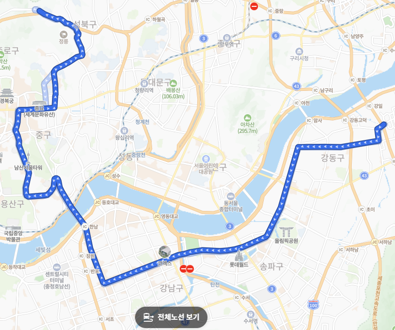 운행노선: 강동공영차고지→신사역→이태원→종각역→혜화역 (주요 경유지만 간략히 표시)