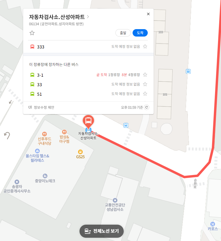 첫 번째 정류장 자동차검사소.산성아파트 위치 알아보기