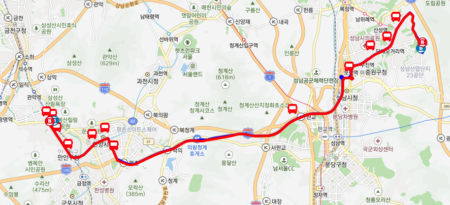 직통 노선: 성남 구시가지에서 안양역까지 직통으로 연결되어 이동 시간을 단축시켜줍니다.