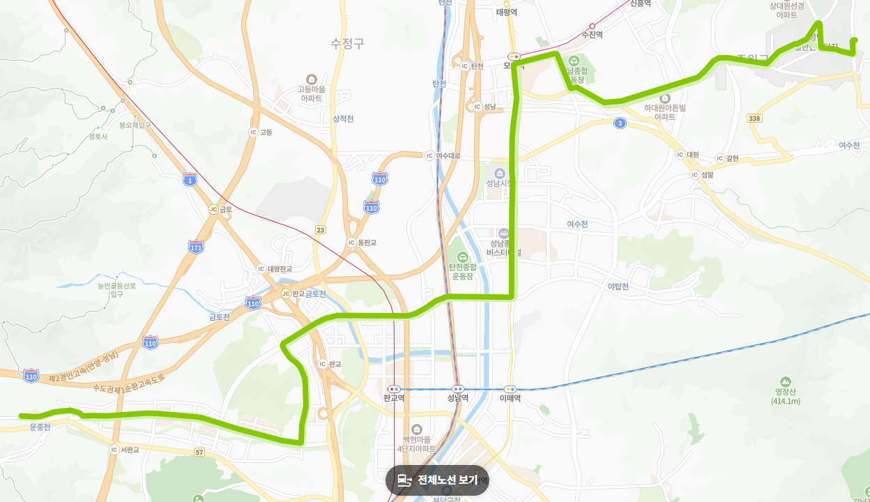 성남 구시가지-분당-판교 연결: 상대원동/하대원동을 중심으로 하는 **구시가지(중원구)**와 **야탑동(분당)**을 거쳐 판교신도시/운중동까지 성남시의 주요 권역을 S자 형태로 이어주어, 성남 내부의 지역 간 이동 편의를 크게 증대시킵니다. 특히 중원구와 서판교(운중동)를 이어주는 중요한 노선 중 하나입니다.
