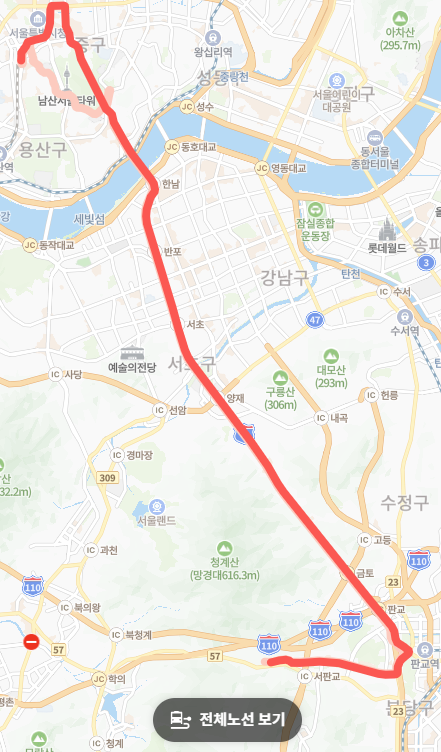 ● 고속도로(경부고속도로) 이용으로 빠른 이동: 판교IC를 통해 경부고속도로에 바로 진입하여 서울 도심으로 향하기 때문에 이동 시간을 단축할 수 있습니다. 고속도로 버스전용차로를 활용하여 출퇴근 시간에도 비교적 빠르게 이동이 가능합니다.