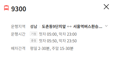 성남 9300번버스 운행노선 도촌동9단지앞→도촌7단지.8단지→도촌초등학교.도촌종합사회복지관→도촌3단지.스위첸파티오1단지→동강프라자앞→도촌1.2단지→분재단지.도촌동1단지→매화마을주공3단지→매화마을3단지→야탑119안전센터→연꽃마을4단지→야탑중학교→동부.코오롱아파트→야탑역.종합버스터미널(전면)→쌍용아파트→삼환진덕아파트→탑마을대우아파트→송현초등학교.판교이지더원2단지→벌말육교→봇들마을7단지→성남역.보평중고등학교→백현마을1단지→판교역.낙생육교.현대백화점→판교TG(경유)→금토JC(경유)→서울진입(경유)→청계산입구역(경유)→양재IC(경유)→서초IC(경유)→반포IC(경유)→한남IC(경유)→순천향대학병원→한남1고가차도(경유)→남산1호터널TG(경유)→남대문세무서.국가인권위원회→종로2가사거리(중)→을지로입구역.광교→롯데백화점→북창동.남대문시장→서울역버스환승센터(5번승강장)(중)