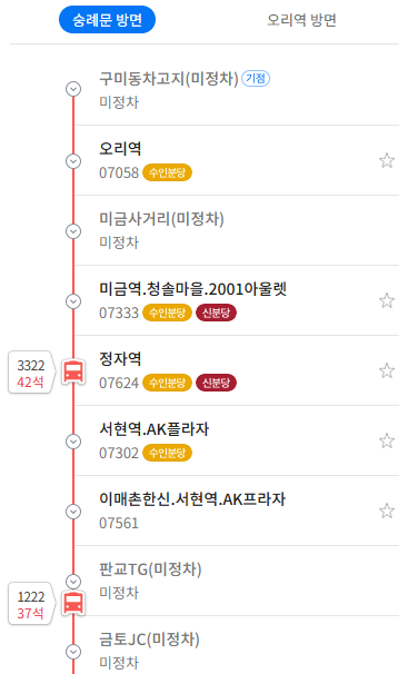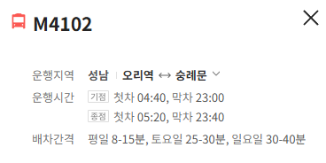 성남 M4102번 버스 운행노선 오리역→미금역.청솔마을.2001아울렛→정자역→서현역.AK플라자→이매촌한신.서현역.AK프라자→판교TG(미정차)→금토JC(미정차)→남대문세무서.국가인권위원회→종로2가사거리(중앙차로)→을지로입구역.광교→북창동.남대문시장→숭례문