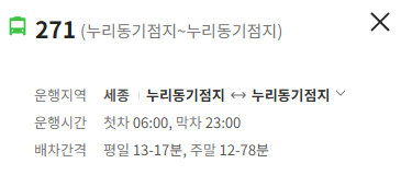 세종 271번 버스 운행노선 누리동기점지→누리동→한별동→산울마을7,8단지→산울동커뮤니티센터→바른초등학교→산울마을3단지→세종충남대학교병원후문→도담동(도램마을)→도램마을8,10단지→도램마을9단지→양지중학교→도램마을14,15단지→도램마을16,19단지→도램마을20단지→원수산MTB공원→해밀마을1단지→산울마을3단지→바른초등학교→산울동커뮤니티센터→산울마을7,8단지→한별동→누리동→누리동기점지