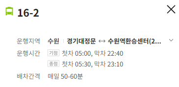 수원 16-2번 버스 운행노선 경기대정문→광교공원.경기대수원캠퍼스입구.연무시장→보훈복지타운아파트→조원뉴타운2단지→조원뉴타운→조원고등학교→조원2동행정복지센터→장안구청→수원KT위즈파크.수원종합운동장→수원종합운동장.한국건강관리협회→수성중사거리→상공회의소.수성고교→정자종합시장→두견마을→화서역→숙지중고교.서호공원→화서1동행정복지센터.수원역푸르지오자이→수원역푸르지오자이.쌍우물택시쉼터→서둔교차로(미정차)→환승센터진입1(미정차)→환승센터진입2(미정차)→수원역환승센터(2승강장)