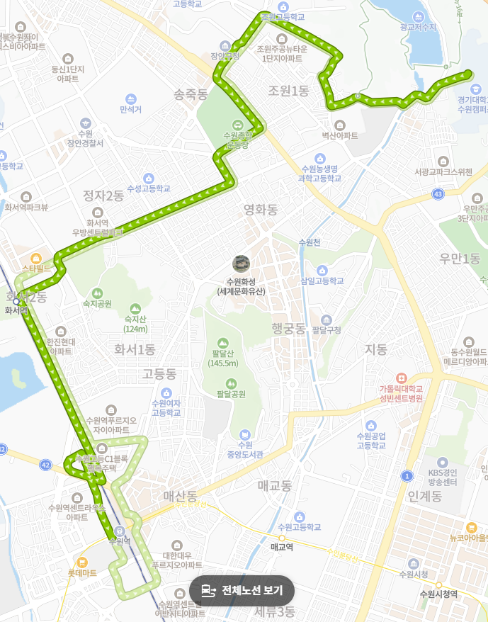 주요 주거지역 관통: 조원동의 조원뉴타운, 보훈복지타운아파트 및 정자동의 정자종합시장, 두견마을, 화서동의 화서역 등 수원 북부와 서부의 주요 주거 밀집 지역을 효율적으로 연결합니다.
