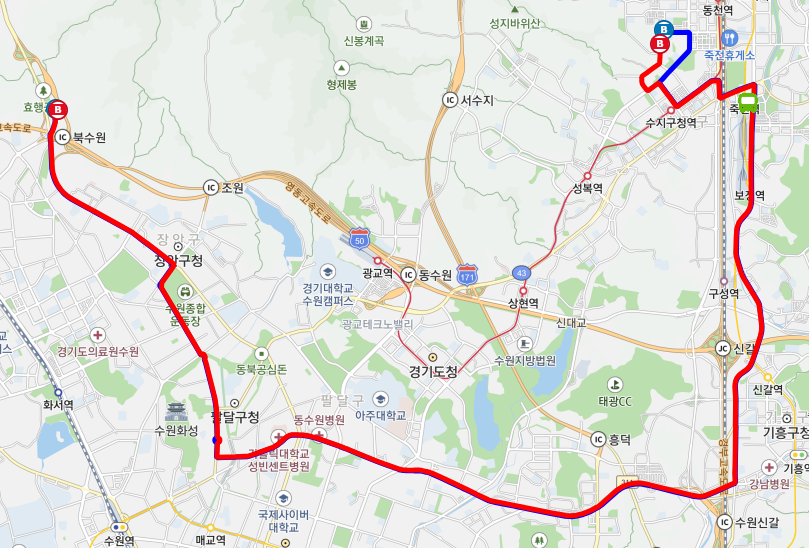 다양한 지역 연결: 수원의 한일타운부터 용인의 죽전역까지 넓은 지역을 연결합니다.