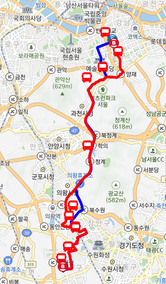 정체 구간 우회: 혼잡한 시내 구간을 우회하고 우면산 터널을 이용하여 이동 시간을 단축합니다.