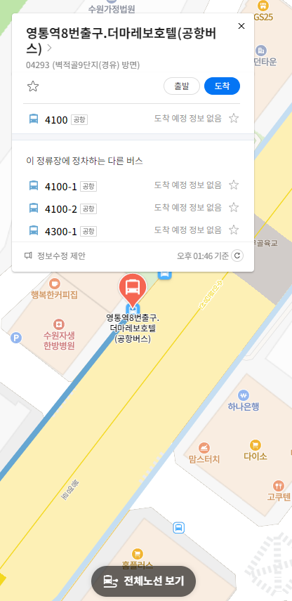 첫 번째 정류장 영통역8번출구.더마레보호텔(공항버스) 위치 알아보기