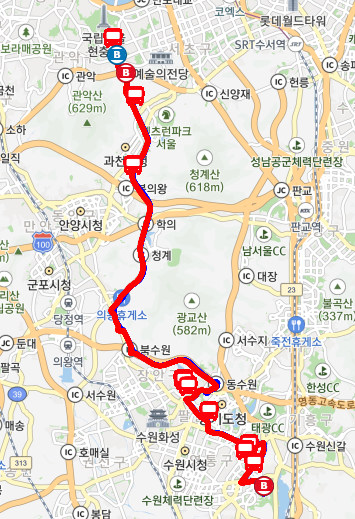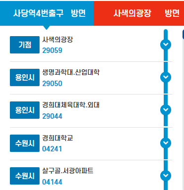 →사색의광장→생명과학대.산업대학→경희대체육대학.외대→경희대학교→살구골.서광아파트→살구골동아아파트→살구골현대아파트.영통역4번출구→영통역→청명역3번출구→황골쌍용아파트→영통빌리지→삼성전자입구→원천레이크파크아파트→광교호반베르디움→KT동수원지사→구법원사거리→아주대학교입구→아주대.아주대학교병원→효성초등학교→수원월드컵경기장.동성중학교→여권민원실.풍림아파트→우만동4단지→경기남부경찰청.봉녕사입구→경기대수원캠퍼스후문.수원박물관→동수원TG(경유)→광교터널진입(경유)→북수원TG(경유)→골사그내교차로(경유)→의왕톨게이트→의왕터널진입(경유)→학의JC(경유)→과천터널진입(경유)→과천IC(경유)→대공원고가교(경유)→과천동행정복지센터→남태령역(중)→사당역(중)→사당역10번출구(경유)→사당역4번출구