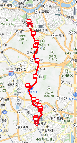 서둔동차고지대기(경유)→차고지출발(경유)→서둔교차로(경유)→수원역→고등동구터미널→고등동사거리→수원여고.푸르지오자이→병무청입구.한국소방안전원경기지부→글로벌청소년드림센터→화서문.장안공원→장안공원→장안문.느림보타운→KT수원지사.국민연금북수원지사→수원종합운동장.수원시체육회관.아너스빌위즈→수원KT위즈파크.경기도청소년활동진흥상담복지센터→한일타운.경기일보.홈플러스→수일여중.대우건설기술연구원.경기도교육청미래과학교육원→수일중학교→한국가스안전공사.택시공제조합→삼익아파트.광교산입구→경기도인재개발원.연구원.평생교육진흥원.여성가족재단→효행공원(경유)→지지대고개(경유)→골사그내교차로(경유)→의왕톨게이트→의왕터널진입(경유)→학의JC(경유)→과천터널진입(경유)→과천IC(경유)→대공원고가교(경유)→과천동행정복지센터→남태령역(중)→사당역(중)
