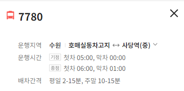 수원 7780번 버스 운행노선 호매실동차고지→호매실스타힐스.수원여대입구→서부공영차고지→권선구청.경기종합노동복지회관→권선구청.한봄고등학교→탑동우방아파트→구운동주민센터.서수원도서관→탑동초등학교.삼성아파트→구운중학교→웃거리.힐스테이트수원테라스→구운오거리.경기중소기업성장지원센터→구운동강남아파트→구운동삼환아파트→율현중학교.녹색교통회관.꽃뫼버들코오롱아파트→엘지아파트.금강아파트→화서역파크뷰.삼환나우빌.효성아파트→정자3동행정복지센터.정자동중심상가→풍림아파트→동신아파트→북수원자이렉스비아정문→파장초등학교.SKC→SK스카이뷰.SK아트리움→이목동.장안힐스테이트→이목동.장안STX칸→동원고교.해우재입구→효행공원(경유)→지지대고개(경유)→골사그내교차로(경유)→의왕톨게이트→의왕터널진입(경유)→학의JC(경유)→과천터널진입(경유)→과천IC(경유)→대공원고가교(경유)→과천동행정복지센터→남태령역(중)→사당역(중)
