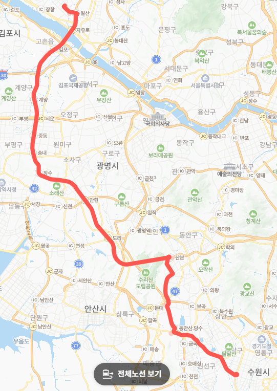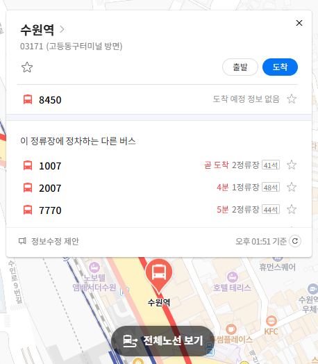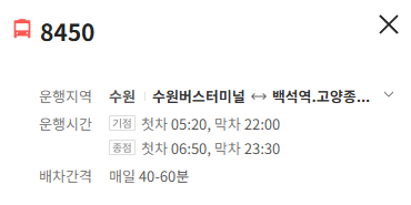 수원 8450번 버스 운행노선 수원버스터미널→수원역(AK플라자)→웃거리.힐스테이트수원테라스→서수원시외버스터미널→산본역→김포영업소→백석동.요진와이시티(중)→백석역.고양종합터미널