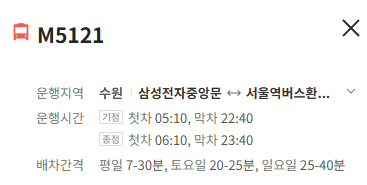 수원 M5121번 버스 운행노선 삼성전자중앙문 → 금성아파트.한국2차아파트 → 광교호수공원입구.원천교사거리 → KT동수원지사 → 소화초등학교 → 광교중앙.경기도청.아주대역환승센터 → 푸르지오월드마크.차세대융합기술연구원 → 국가인권위.안중근활동터(중) → 서울시청 → 신한은행본점 → 서울역버스환승센터(6번승강장)(중)