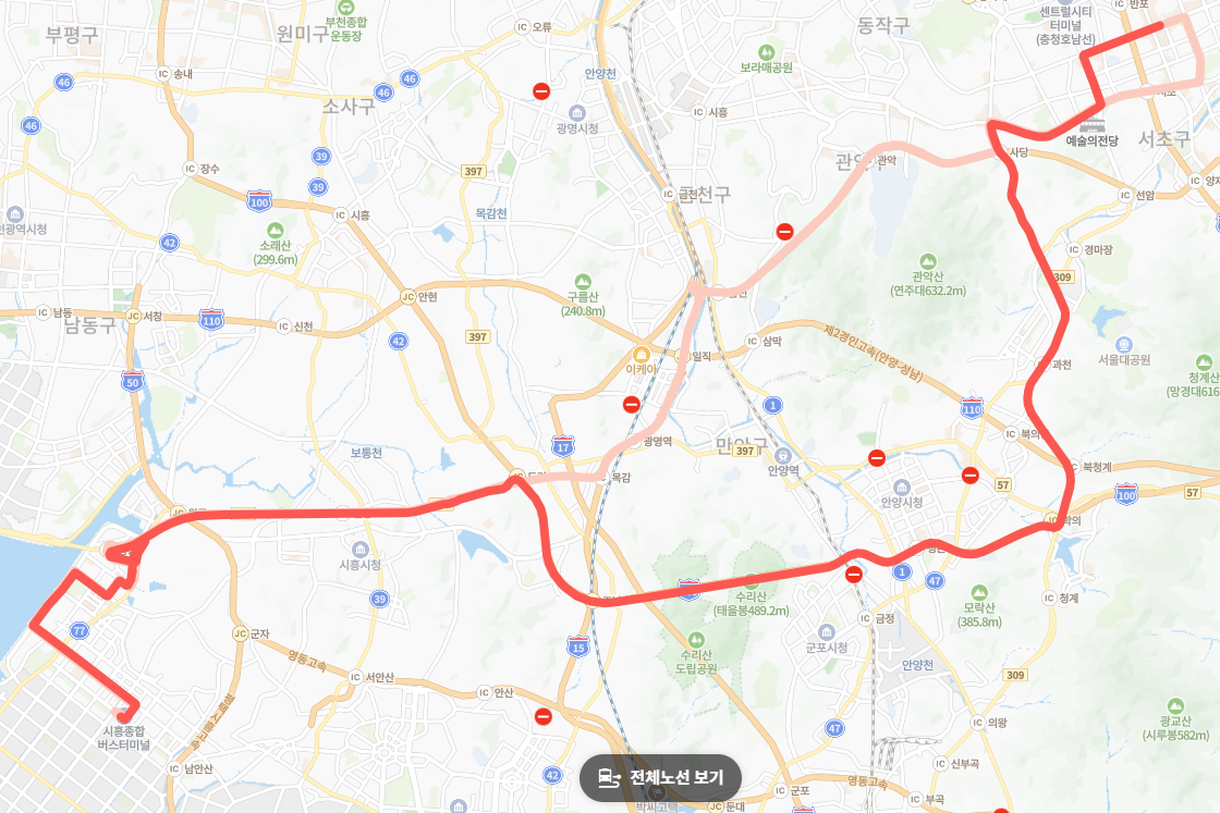 시흥 3400번 버스 운행노선 한국공학대학교.시흥터미널→영남6차아파트→이마트→중앙도서관→주공5단지→건영4단지→건영7차.신호새피앙→한라3차.이지더원→한라비발디1차→서울대시흥캠퍼스.한라1차→생명공원→배곧중심상가→호반3차.한신아파트→배곧라온초→신세계프리미엄아울렛→정왕TG(미정차)→월곶JC(미정차)→연성IC(미정차)→물왕(미정차)→조남JC(미정차)→산본IC(미정차)→평촌IC(미정차)→학의JC(미정차)→과천터널진입(미정차)→과천IC(미정차)→대공원고가교(미정차)→남태령역(중)→사당IC출입(미정차)→사당역3번출구→예술의전당앞(미정차)→서초아트자이아파트→서초역1번출구→교대역→서초아르누보호텔(미정차)→삼성서초역삼세무서