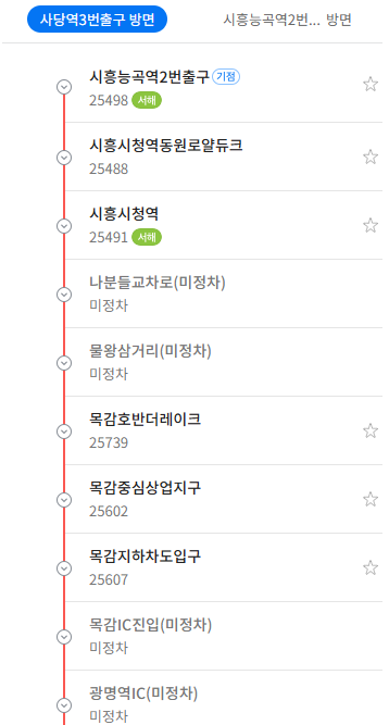 시흥 6501번 버스 운행노선 시흥능곡역2번출구→시흥시청역동원로얄듀크→시흥시청역→나분들교차로(미정차)→물왕삼거리(미정차)→목감호반더레이크→목감중심상업지구→목감지하차도입구→목감IC진입(미정차)→광명역IC(미정차)→일직JC(미정차)→금천(미정차)→봉천터널진입(미정차)→사당IC출입(미정차)→사당역3번출구
