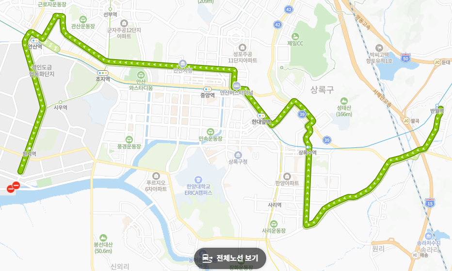 주요 시설 경유: 노선이 안산시의 핵심 상업지구와 행정 거점을 통과합니다.