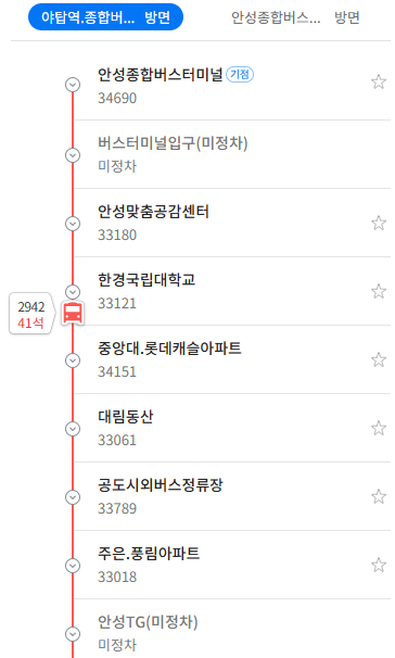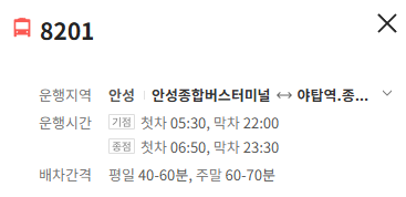 안성 8201번 버스 운행노선 안성종합버스터미널→안성맞춤공감센터→한경국립대학교→중앙대롯데캐슬아파트→대림동산→공도시외버스정류장→주은풍림아파트→안성TG(무정차)→판교역낙생육교현대백화점→야탑역종합버스터미널