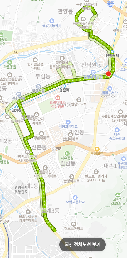 범계중학교, 평촌고등학교, 부안중학교 등 주요 학교들을 경유하여 학생들의 등하교를 책임집니다. 또한 평촌 학원가와도 인접한 경로를 가지고 있어 학생과 학부모들에게 만족도가 매우 높은 노선입니다.