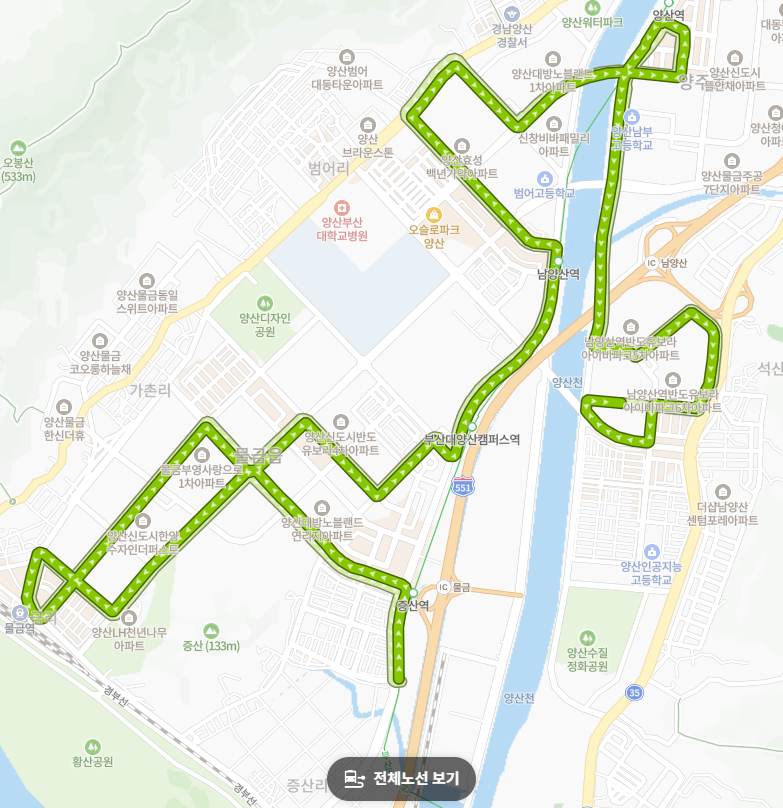 물금신도시(증산, 가촌 일대)의 신축 아파트 단지들부터 양산시청이 있는 원도심, 그리고 웅상 방면으로 넘어가는 길목까지 넓게 커버합니다. 양산의 새로운 인프라와 기존 행정 중심지를 한 번에 연결하는 효율적인 동선을 가지고 있습니다.