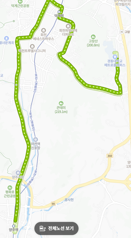 단절 없는 이동 경로: 경동대학교 인근에서 출발하여 주거 단지와 역, 그리고 양주시청을 거쳐 양주역으로 이어지는 흐름은 지역 주민들의 생활 동선에 매우 적합합니다.