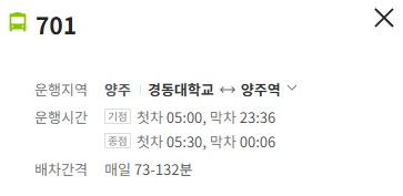 양주 701번 버스 운행노선 경동대학교→지게동입구→상동슈퍼→다리앞→농협하나로마트→축산위생연구소→고덕구장→현진에버빌아파트→도둔이입구→덕계로→도둔초등학교.파밀리에더퍼스트→한양수자인.삼희아파트→덕계역→덕계역.현대윤중아파트→로제비앙더센트럴.덕계중학교→금강펜테리움.트루엘시그니처→샘내고개→샘내→경기섬유종합지원센터→샘내부대→승마장입구→양주시청.시청보건소→양주역