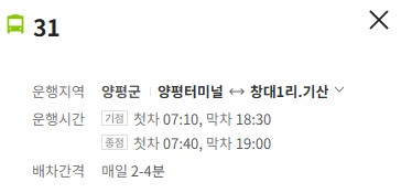 광역 교통망 연계: 31번 버스를 이용해 양평역(경의중앙선)이나 양평터미널(시외버스)로 이동하면, 서울 및 수도권의 다른 지역으로 편리하게 진입하거나 이동할 수 있는 발판이 됩니다.