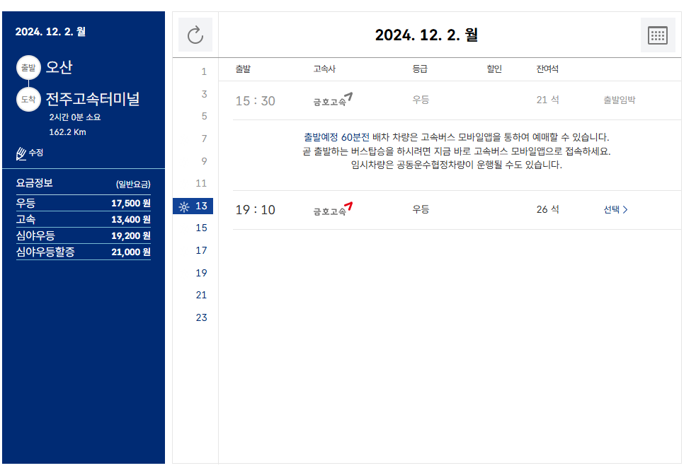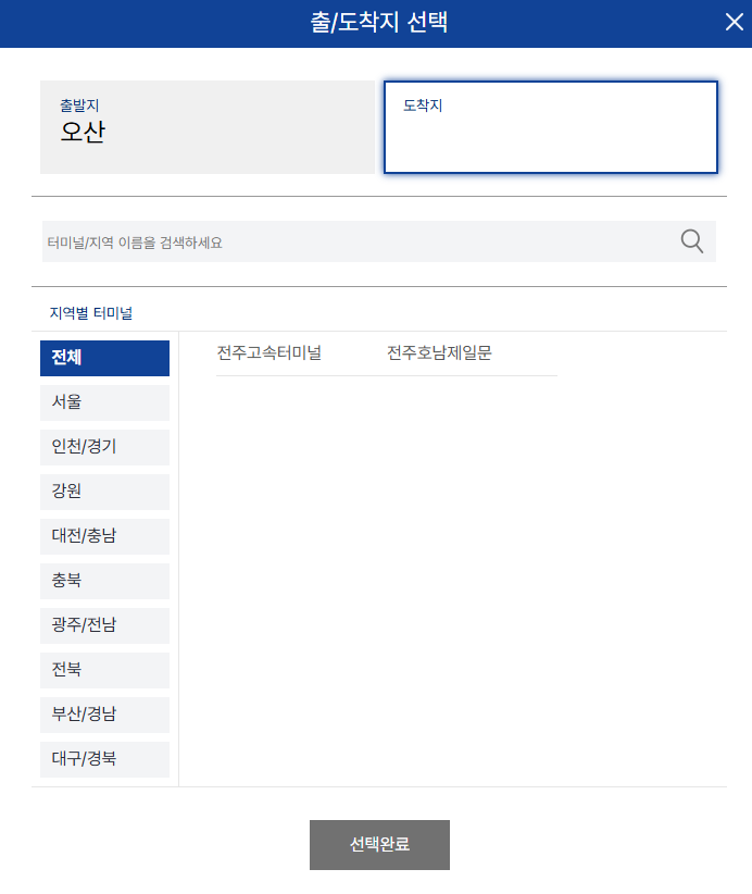 2. 출발지 오산 → 도착지 (전주, 전주호남제일문) 선택 → 조회하기