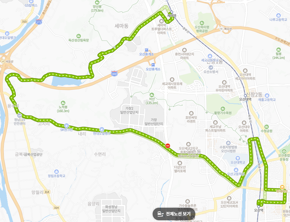 세마역 (1호선): 노선이 오산역 외에 세마역까지 연결해 줌으로써, 오산 서부 및 정남면 주민들은 필요에 따라 두 전철역 중 원하는 곳에서 1호선을 이용할 수 있는 선택의 폭을 넓혀줍니다.