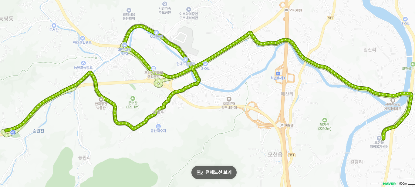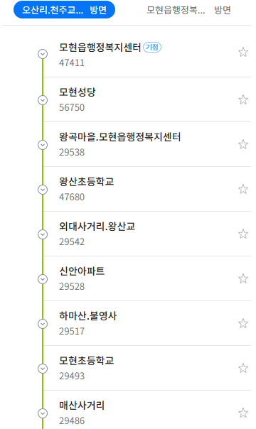 모현읍 주거지와 행정 중심지의 완벽한 연결모현읍 행정복지센터를 기점으로 왕산리, 매산리 일대의 주요 주거 단지를 연결합니다. 주민들이 행정 업무를 보거나 읍사무소 인근의 상권, 병원, 은행 등을 이용할 때 가장 편리하게 이용할 수 있는 노선입니다.