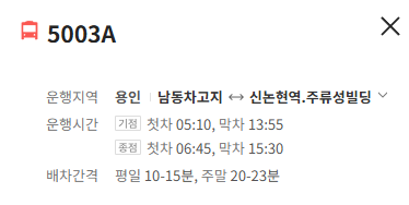용인 5003A번 버스 운행노선 남동차고지→안터입구→대촌→평옥→남동구미마을→보보스타운→교수마을→동진마을→명지대앞→이마트.상공회의소→역북동행정복지센터.신성아파트.명지대승차...→동원로얄듀크.용인등기소→시청.용인대역→진우.늘푸른오스카빌.우남퍼스트빌아파트→삼가동.궁촌→삼가역.두산위브→멱조현풍림아파트→용인미르스타디움→화운사입구→초당주공3단지후문→초당초등학교.현진에버빌→초당중학교.삼부르네상스아파트→동백경남아너스빌→동백역.성산마을서해그랑블→동백2동행정복지센터→쥬네브상가→동백소방서.동일하이빌.롯데캐슬→동백고.풍림코아루.호수마을서해그랑블→동백중학교→동막초등학교.호수마을계룡리슈빌.어울림→두산위브더제니스.호수마을.자연엔데시앙→동백이마트→어정역→어정풍림아파트→갈천마을→지석역→어정삼거리.강남마을→강남대역.강남대입구→수원컨트리클럽→기흥역→롯데캐슬스카이.이안두드림.백남준아트센터→상미마을.신갈오거리.롯데캐슬레이시티→수원신갈TG(미정차)→신갈JC(미정차)→죽전(미정차)→금곡(미정차)→서울TG(미정차)→판교IC(미정차)→금토JC(미정차)→서울진입(미정차)→청계산입구역(미정차)→양재IC(미정차)→서초IC(미정차)→반포IC출입(미정차)→신논현역.주류성빌딩