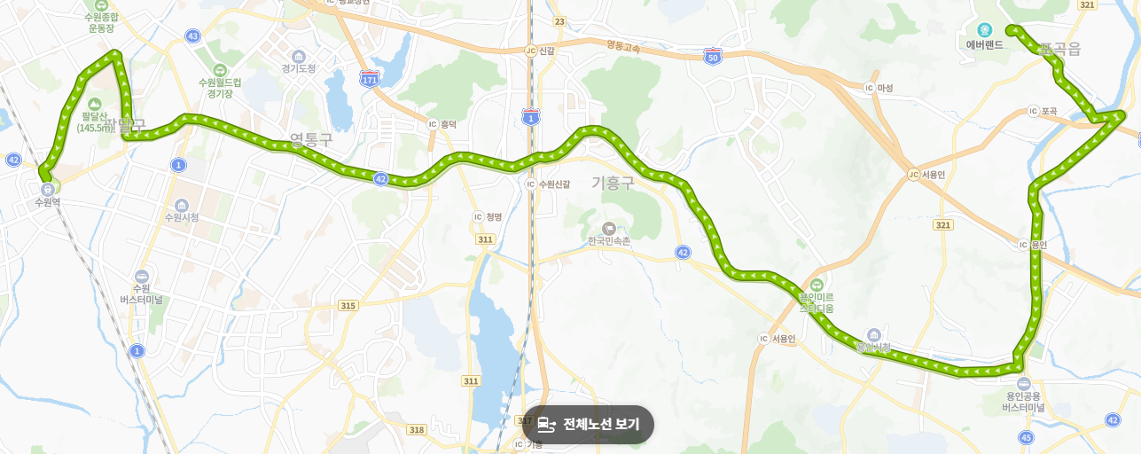 수원역 연결: 수원시의 핵심 교통 허브인 수원역까지 운행하여, 수도권 전철 1호선, 수인분당선, KTX 및 새마을호 등 광역 철도망과의 환승이 매우 편리합니다. 이는 용인 시민들이 타 지역으로 이동하는 데 결정적인 이점을 제공합니다.