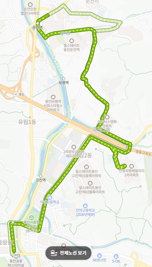 용인중앙시장역과 둔전역을 모두 경유합니다.