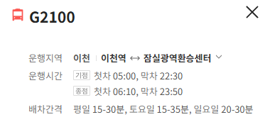 이천 G2100번 버스 운행노선 이천역→상공회의소→이천터미널→이천고교입구→(구)보건소→대원칸타빌.한양수자인→동양아파트입구→도암IC→도암교차로(미정차)→열미교차로(미정차)→쌍동JC(미정차)→태전JC(미정차)→광주직동IC(미정차)→섬말IC(미정차)→성남IC진입(미정차)→성남TG(미정차)→가천대→송파IC출입(미정차)→장지역.가든파이브(중)→문정법조단지.건영아파트→문정로데오거리입구→가락시장.가락시장역(중)→송파역→석촌역→석촌호수.한솔병원→석촌역교차로(미정차)→잠실광역환승센터(지하)