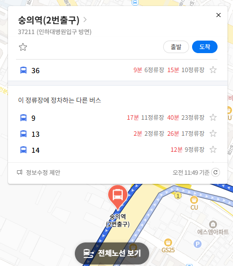 주요 버스 정류장 숭의역(2번출구) 위치 알아보기