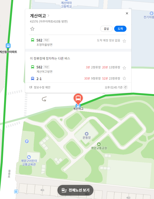 582번 버스 운행노선 계산여고→초정마을→계산동아아파트→태산아파트→대동아파트→한진아파트→영음교회.효성해링턴플레이스→서운동→서운교→현대2차아파트→은영빌라→현광아파트→대성유니드아파트→갈산태화아파트→부평북초등학교→갈산사거→갈산역→한국지엠기술교육원→삭은다리한국지엠→부평구청→부평경찰서→금호아파트→청천도서관→동광제일교회→혜성프라자→산곡교회→우성아파트→산곡동주안빌딩→동아아파트후문→부원여중·동아아파트→부원중학교→부평역→부평역
