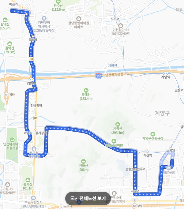 노선 중간에 회차 구간이 설정되어 있어, 계양구 내에서 여러 정류장을 순환하며 주민들의 이동 수요를 촘촘히 충족시키고 있습니다. 특히 주거 지역과 상업 시설(롯데마트 계양점)을 효율적으로 연결합니다.