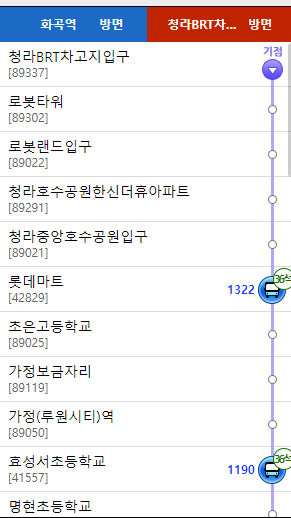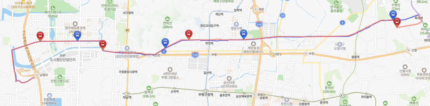청라BRT차고지입구→로봇타워→로봇랜드입구→청라호수공원한신더휴아파트→청라중앙호수공원입구→롯데마트→초은고등학교→가정보금자리→가정(루원시티)역→효성서초등학교→명현초등학교→작전역→까치말사거리→도두리마을→계양체육관(아시아드양궁장)→부천오정물류단지(중)→오정휴먼시아(중)→원종IC(중)→화곡역6번출구