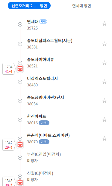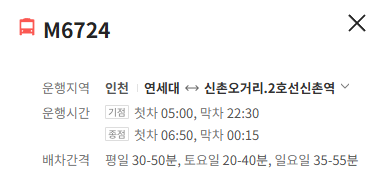 인천 M6724번 버스 운행노선 연세대국제캠퍼스→송도더샵퍼스트월드(서문)→송도자이하버뷰→더샵엑스포빌리지→송도풍림아이원2단지→동춘역(이마트.스퀘어원)→영등포세무서.선유고등학교→합정역→홍대입구역→신촌오거리.현대백화점→신촌오거리.2호선신촌역