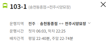 전주 103-1번 버스 운행노선 송천동종점→동부대로농수산시장→농수산시장내→농수산시장.메가월드→메가월드→동부대로여의역→반월초교.세움펠리피아2차→여의동우체국→조촌초교.제일아파트→전주공고→도시첨단산업단지→기린대로경제통상진흥원→휴비스전주공장→팔복예술공장.이팝나무철길→팔복근린상가→추천대교→덕일초중→도립국악원→도립여성중고롯데마트→송천삼거리.송천초교→용소마을제일아파트→송천대명아파트→송천롯데아파트→농수산시장내→송천동성원무지개아파트→송북초교→송천주공2단지→송천현대아파트→송천주공아파트→송천도서관.솔내청소년센터→대송장례식장→화정마을→호성진흥3단지→호성진흥더블파크→전주출입국외국인사무소→호성동아아파트→호성동신아파트→기린중→전주역첫마중길→덕진보건소.한국전기안전공사전북본부→명주골네거리.대자인병원→북일초교→전주시민기록관→기린초교→고용노동부전주지청→아중대우아파트→아중현대아파트→중앙여고→하인교마을→아중호수.인교마을입구.아중요양병원→전주시양묘장