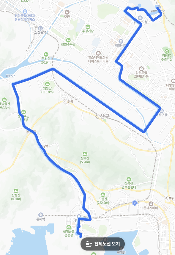 장복터널 통과: 창원 성산구 및 의창구 도심에서 진해구 도심(인의동, 진해역 등)을 오갈 때 장복터널을 통과하여, 다른 노선에 비해 두 지역을 신속하게 이어줍니다.