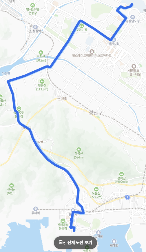진동면 지역 커버: 진동면 지역에서 출발하여 창원 도심까지 접근하기 때문에, 이 지역 주민들이 대중교통을 이용하여 시내 주요 거점(상남동, 창원대 등)으로 이동하기에 매우 유용합니다.