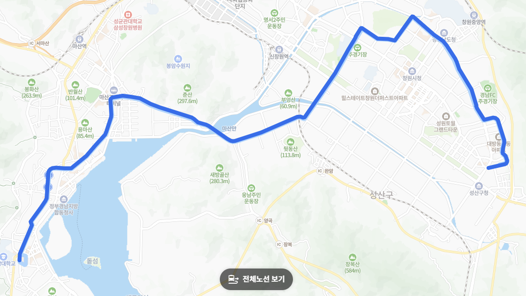 봉암교를 통한 빠른 연결: 다른 노선들이 우회하는 곳을 거치지 않고 봉암교를 이용하여 마산과 창원 시가지를 신속하게 오갈 수 있다는 직행좌석 노선의 고유한 장점을 그대로 유지합니다.